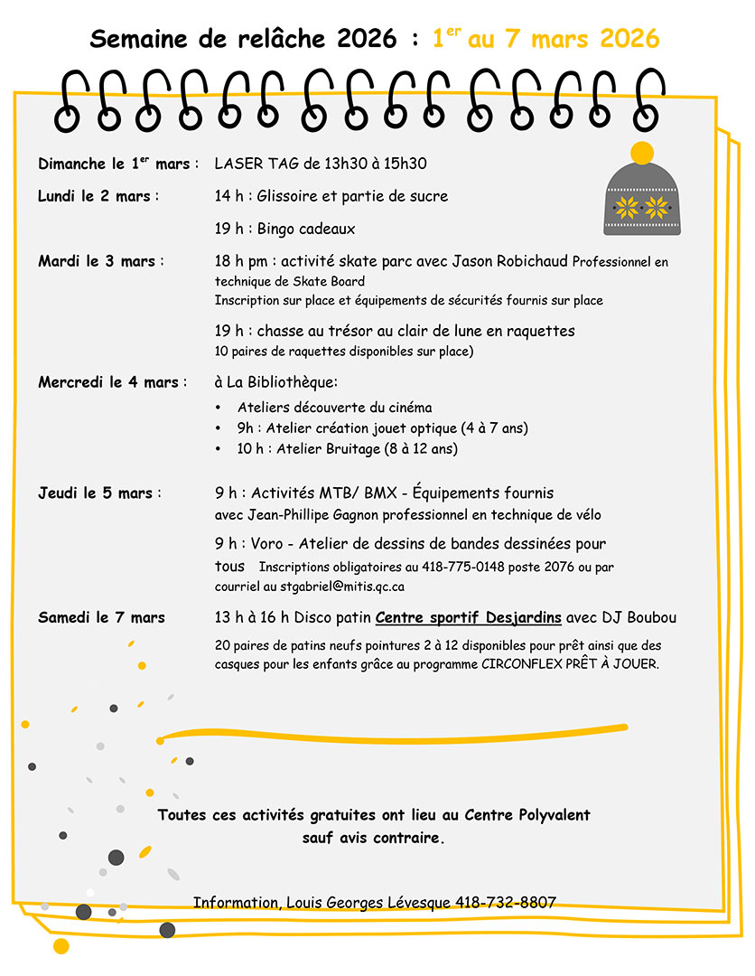 Vous cherchez quoi faire du 1er au 7 mars 2026 ? Le programme officiel de la semaine de relâche est arrivé, et la meilleure nouvelle : toutes les activités sont gratuites !